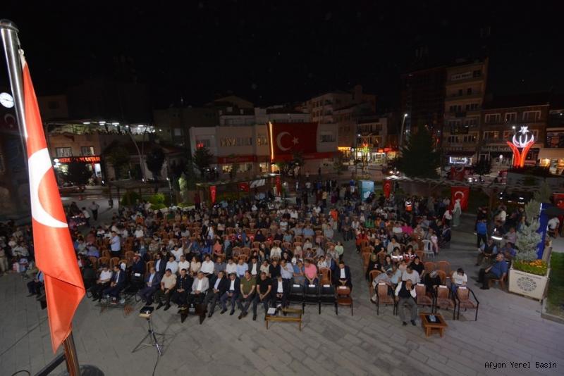 FETÖ terör örgütü tarafından planlanan ama milletimizin üstün gayretiyle başarısız olan hain darbe girişiminin 7. Yılı, Sandıklı Belediyesi önünde bulunan; 15 Temmuz Demokrasi Meydanında, vatandaşların katılımıyla yapılan etkinliklerle gerçekleşti.Kaymakam Mehmet Sülün, Belediye Başkanı Dr. Mustafa Çöl, İlçe Jandarma Komutanlığı Vekili Üsteğmen Mukadder Demir, İlçe Emniyet Müdürü Bayram Öğüt, Cumhuriyet Savcısı Muhammed İkbal Doğan, ilçe protokolü, siyasi parti temsilcileri, sivil toplum kuruluşları temsilcileri, gazi yakınları ve çok sayıda vatandaşımızın katıldığı etkinlikler 00:13’de okunan sela’lara kadar devam etti.Gece Kuran-ı Kerim tilaveti ile başladı. Akabinde günün anlam ve önemine istinaden okunan şiirler ile sürdü. İlçe Müftülüğümüze bağlı hocalarımız tarafından okunan kaside ve ilahilerin ardından, 15 Temmuz Demokrasi ve Milli Birlik Günü anısına yapılan; Masa Tenisi, Voleybol, Atletizm, Satranç gibi dallarda dereye giren sporcu kardeşlerimize kupaları takdim edildi.Sandıklı Belediyesi tarafından etkinliğe katılan vatandaşlara Şerbet ve Helva ikramı yapılan gecede, 00:13’de bütün Türkiye ile aynı anda okunmaya başlayan sela’ların bitişi ile sona erdi.