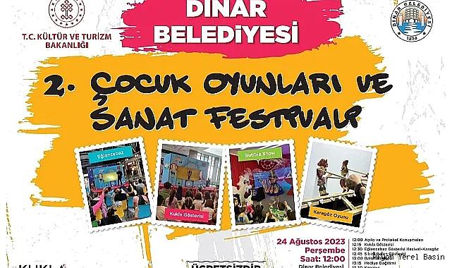 Dinar Belediye Başkanı Nihat Sarı’nın girişimleriyle Kültür Turizm Bakanlığı ve Belediyemiz İşbirliğiyle bu yıl 2.sini düzenleyecek olduğumuz Çocuk Oyunları ve Sanat Festivali 24 Ağustos 2023 Perşembe günü saat 12:00’de Belediyemiz Kültür Salonunda gerçekleşecek.