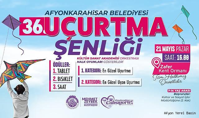 Şehrimizde geleneksel hale gelen uçurtma şenliği 21 Mayıs Pazar günü Zafer Kent Ormanında yapılacak. Rengârenk uçurtmalar Afyonkarahisar semalarını süsleyecek, dereceye girenler ödüllerini Belediyemizden alacak. 36.’sı yapılacak Uçurtma Şenliği için başvurular alınıyor.Birbirinden renkli uçurtmaların gökyüzünde görsel şölen sunacağı şenlikte, uçurtması en güzel olan ve uçurtmayı en iyi uçuranlar çeşitli ödüllerle ödüllendirilecek.BAŞVURU SÜRECİ36. Uçurtma Şenliği için başvurular alınmaya başladı. Katılım sağlamak isteyenler Belediyemiz Hizmet Binası 2. Kat Kültür ve Sosyal İşler Müdürlüğüne başvuru yapabilecek. Uçurtma Şenliği 2 kategoride yapılacak. En güzel uçurtma ve en güzel uçan uçurtma kategorisinde dereceye girenlere tablet, bisiklet ve akıllı saat hediye edilecek. Şenlik kapsamında Kültür Sanat Akademisi Orkestrası sahne alacakken ayrıca halk oyunları gösterileri de düzenlenecek. Eğlenceli anlara sahne olacak şenliğimize tüm halkımız davetli.