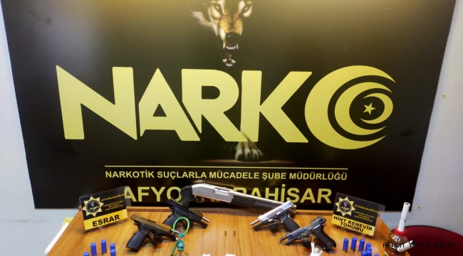 Afyonkarahisar İl Emniyet Müdürlüğü görevlilerince uyuşturucu veya uyarıcı madde imalatı ve ticareti suçu ile ilgili yürütülen soruşturma kapsamında yapılan çalışmalar neticesinde il merkezinde 7 ve İstanbul ilinde 1 şahıs olmak üzere 8 şahsın yakalanmasına yönelik olarak 19.01.2021 günü 9 adrese eş zamanlı olarak operasyon gerçekleştirilmiş olup yapılan ikamet aramalarında; - Satışa hazır 2 pakette 1,67 gram esrar maddesi- 2 paket halinde 1,47 gram kenevir tohumu- 3 adet kurusıkıdan bozma tabanca- 1 adet kurusıkı tabanca- 1 adet kısa dipçikli pompalı tüfek- 23 adet av tüfeği kartuşu- 3 adet uyuşturucu kullanma aparatı ele geçirilmiştir. Konu ile ilgili 8 şahıs gözaltına alınmış, şahıslara TCK 188 (Uyuşturucu Madde Ticareti) suçundan adli işlem başlatılmıştır.