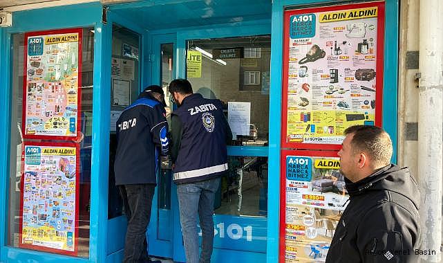Mühürleme işleminin ardından 10 günlüğüne geçici olarak kapatılan A101 Market Şubesi çalışanları tarafından kapısı kilitlendi.