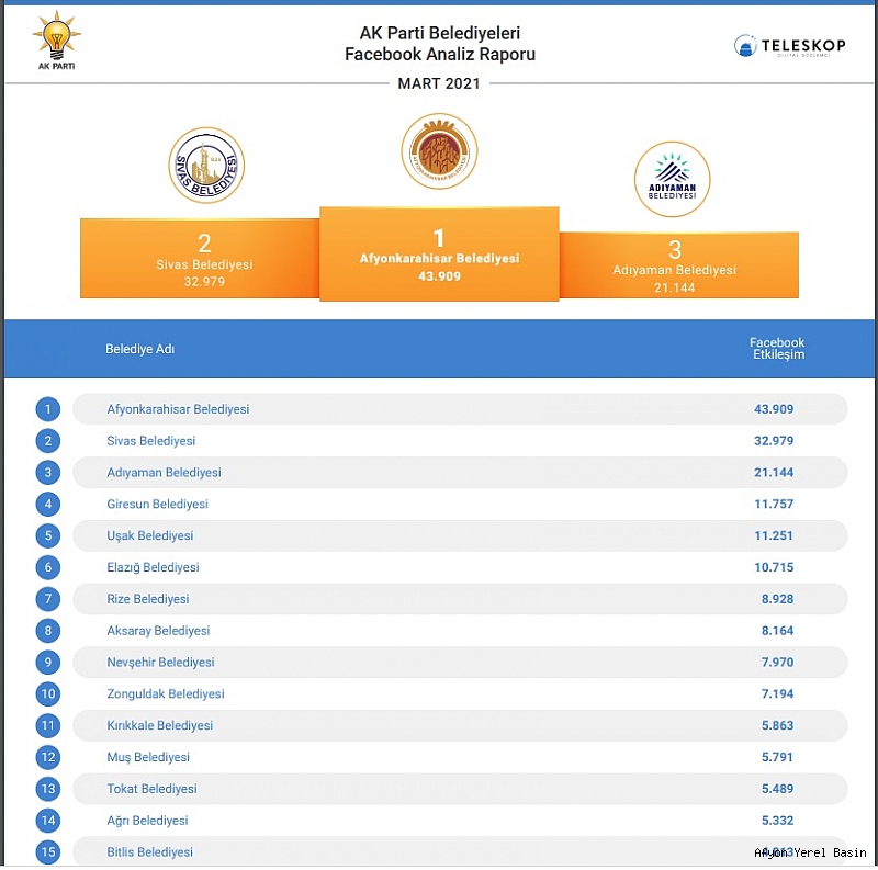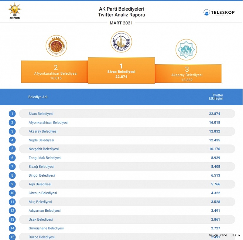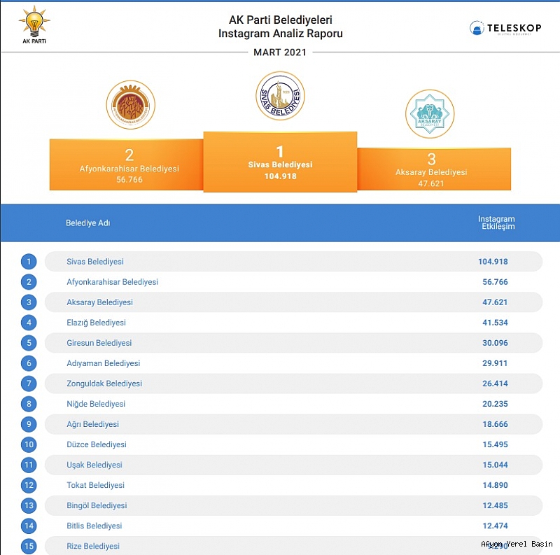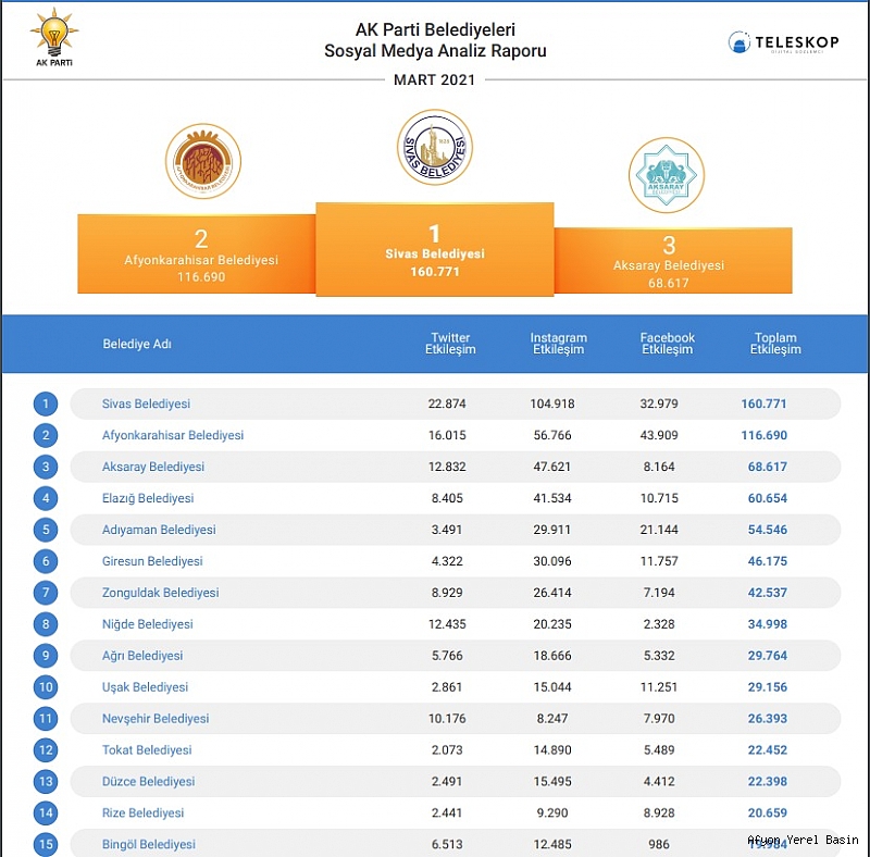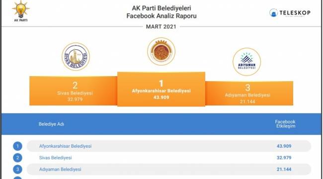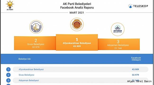 Mart ayı sosyal medya analiz raporları açıklandı. Afyonkarahisar Belediyesi, 24 AK Partili il belediyesi arasında Facebook’da birinci Twitter'da ikinci, Instagram'da ise yine ikinci sırada yer aldı.