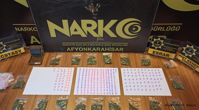 Afyonkarahisar İl Emniyet Müdürlüğü görevlilerince, ilimiz merkezde sokak satıcılarına yönelik yapılan çalışmalar neticesinde 2 ayrı olayda 4 şüpheli şahsa işlem yapılmış, şahısların ikametlerinde ve üst aramalarında; - 84 adet sentetik ecza,- 268 adet ecstasy maddesi,- 17 adet şeffaf poşet içerisinde toplam 40,41 gram esrar maddesi,- 1 adet şeffaf poşet içerisinde 5,19 gram gelen kenevir tohumu,- 57 adet uyuşturucu madde paketlemede kullanıldığı değerlendirilen şeffaf poşet ele geçirilmiştir. Konu ile ilgili olarak yapılan tahkikat neticesinde bir şüpheli şahıs hakkında TCK 191( Kullanmak İçin Uyuşturucu veya Uyarıcı Madde Satın Almak, Kabul Etmek veya Bulundurmak) suçundan işlem yapılmış, üç şüpheli şahıs da 24/12/2020 günü TCK 188 (Uyuşturucu ve Uyarıcı Madde Ticareti Yapmak) suçundan adli işlem yapılmak üzere gözaltına alınmıştır.