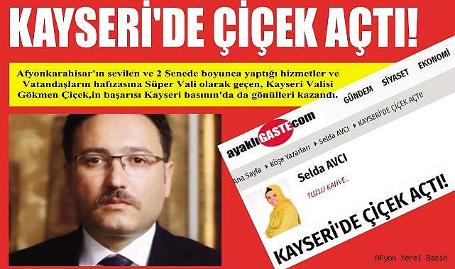 Afyonkarahisar'ın sevilen ve 2 Senede boyunca yaptığı hizmetler ve Vatandaşların hafızasına Süper Vali olarak geçen, Kayseri Valisi Gökmen Çiçek,in başarısı Kayseri basının'da da gönülleri kazandı. Kayseri Ayaklıgaste Köşe Yazarı Selda Avcı'nın Köşe yazsında kalemine aldığı Vali Gökmen Çiçek için, "Kayseri'de Çiçek açtı" başlığı ile mükemmel bir yazı kaleme alındı. Yazar Sevda Avcı'nın kaleme aldığı Kayseri'de Çiçek açtı makalesiKayseri’ye gelişi ile şehir adeta devasa bir değişime uğradı…