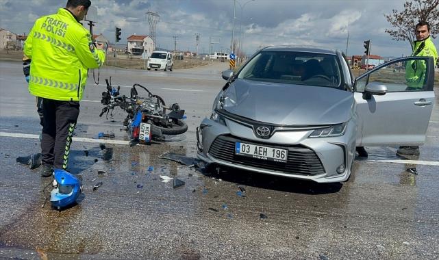 Afyonkarahisar'da otomobille çarpışan motosikletin sürücüsü yaralandı.K.O. (51) idaresindeki 03 AEH 196 plakalı otomobil, çevre yolu üzeri Ertuğrul Gazi Mahallesi eski Çevik Kuvvet Kavşağı'nda Y.D. (21) yönetimindeki 03 AEH 038 plakalı motosikletle çarpıştı.Kazanın ardından çevredekilerin haber vermesiyle bölgeye polis ve 112 acil servis ekipleri sevk edildi.Kazada yaralanan Y.D. Afyonkarahisar Devlet Hastanesine kaldırıldı.