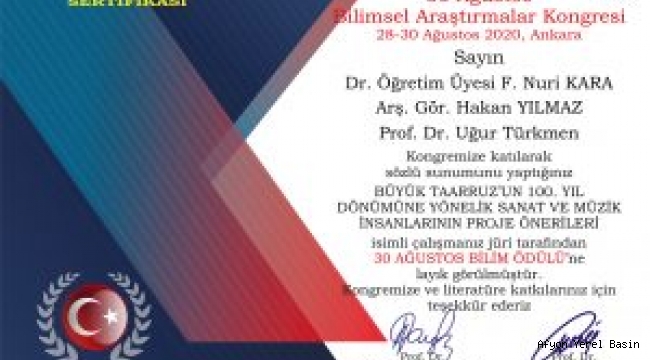 28-30 Ağustos 2020 tarihleri arasında Ankara’da online olarak düzenlenen 2. Uluslararası 30 Ağustos Bilimsel Araştırmalar Sempozyumu’nda; Güzel Sanatlar Fakültesi Dekan Yardımcısı Dr. Öğr. Üyesi Fevzi Nuri Kara ve Arş. Gör. Hakan Yılmaz ile Devlet Konservatuvarı Müdürü Uğur Türkmen, “Büyük Taarruz’un 100. Yıl Dönümüne Yönelik Sanat ve Müzik İnsanlarının Proje Önerileri” başlıklı bildirileri, kongre bilim kurulu ve jürisi tarafından “30 Ağustos Bilim Ödülü’ne layık görüldü.