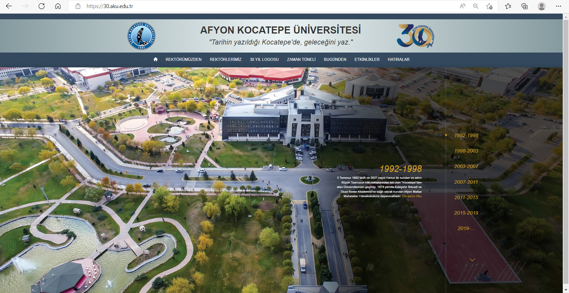 Web sayfasında “Rektörümüzden, Rektörlerimiz, 30. Yıl Logosu, Zaman Tüneli, Bugünden, Etkinlikler ve Hatıralar” şeklinde sekmeler yer alıyor.