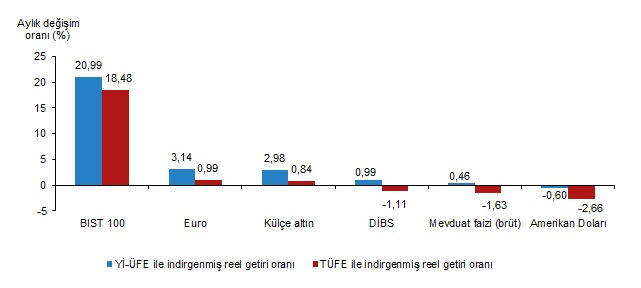 Yİ-ÜFE ile indirgendiğinde; yatırım araçlarından Euro %3,14, külçe altın %2,98, Devlet İç Borçlanma Senetleri (DİBS) %0,99 ve mevduat faizi (brüt) %0,46 oranlarında yatırımcısına reel getiri sağlarken; Amerikan Doları %0,60 oranında yatırımcısına kaybettirdi. tÜfe ile indirgendiğinde Euro %0,99 ve külçe altın %0,84 oranlarında yatırımcısına reel getiri sağlarken; DİBS %1,11, mevduat faizi (brüt) %1,63 ve Amerikan Doları %2,66 oranlarında yatırımcısına kaybettirdi.
