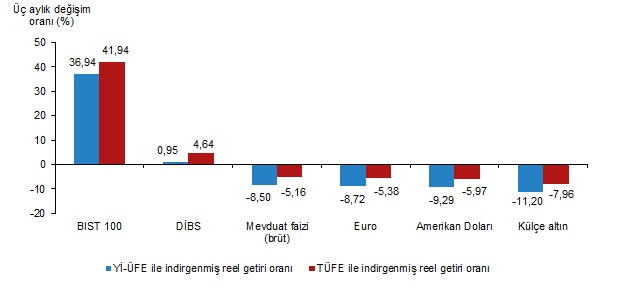 BİST 100 endeksi, üç aylık değerlendirmede; Yİ-ÜFE ile indirgendiğinde %36,94, TÜFE ile indirgendiğinde ise %41,94 oranlarında yatırımcısına en yüksek reel getiri sağlayan yatırım aracı olurken, külçe altın Yİ-ÜFE ile indirgendiğinde %11,20, TÜFE ile indirgendiğinde ise %7,96 oranlarında yatırımcısına en çok kaybettiren yatırım aracı oldu.