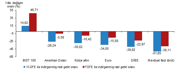 Yıllık değerlendirmede, Yİ-ÜFE ile indirgendiğinde; yatırım araçlarından Amerikan Doları %26,24, külçe altın %30,02, Euro %34,05, DİBS %39,82 ve mevduat faizi (brüt) %51,65 oranlarında yatırımcısına kaybettirdi. TÜFE ile indirgendiğinde ise Amerikan doları %5,59, külçe altın %10,42, Euro %15,58, DİBS %22,97 ve mevduat faizi (brüt) %38,11 oranlarında yatırımcısına kaybettirdi.