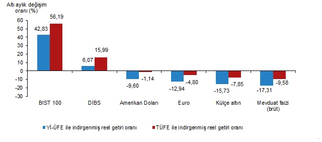 Altı aylık değerlendirmeye göre BIST 100 endeksi; Yİ-ÜFE ile indirgendiğinde %42,83, TÜFE ile indirgendiğinde ise %56,19 oranlarında yatırımcısına en yüksek reel getiri sağlayan yatırım aracı olurken, aynı dönemde mevduat faizi (brüt) Yİ-ÜFE ile indirgendiğinde %17,31, TÜFE ile indirgendiğinde ise %9,58 oranlarında yatırımcısına en çok kaybettiren yatırım aracı oldu.