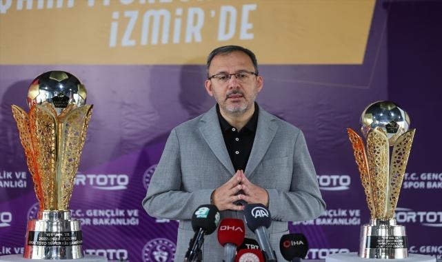Gençlik ve Spor Bakanı Mehmet Muharrem Kasapoğlu, Spor Toto Süper Lig ve Spor Toto 1. Lig'de 2022-2023 sezonunu şampiyon tamamlayacak takımlara verilecek kupaların tanıtımını gerçekleştirdi.Alsancak Gençlik Merkezi'nde düzenlenen tanıtım programında Bakan Kasapoğlu, 19 Mayıs Gençlik ve Spor Bayramı'nı tebrik edip, Gazi Mustafa Kemal Atatürk ile silah arkadaşlarını rahmetle andıklarını vurguladı.Kasapoğlu, kadın voleybolunun kulüpler düzeyinde Avrupa'daki en prestijli organizasyon olan CEV Şampiyonlar Ligi'nde iki Türk takımı VakıfBank ile Eczacıbaşı Dynavit'in final oynadığını ve VakıfBank'ın 6. kez şampiyonluğa ulaştığını belirterek, iki takımı da tebrik etti.Kadın sporcuların başarısının kendilerini ayrıca mutlu ettiğini dile getiren Kasapoğlu, şöyle konuştu:"Devlet, hükümet ve bakanlık olarak voleybola verdiğimiz desteğin dünyada başka bir örneği yok. Biz nasıl tüm branşlara destek veriyorsak, voleybolumuzu da büyütmeye devam edeceğiz. 50'den fazla branşta Türkiye'nin 2022 yılında başarısı var. Bu yıl da aynı ivmeyle başarılar yeni rekorlarla devam ediyor. Bu rekorları nasıl 2020 Tokyo'da ilklerle, rekorlarla taçlandırdıysak, 2024 Paris'te de yeni rekorları, yeni ilkleri milletimize yaşatacağız. Bu gururu yaşatan tüm sporcularımızı, onları yetiştiren teknik adamaları ve aileleri yürekten tebrik ediyorum."Futbol liglerinde sona yaklaşıldığını hatırlatan Kasapoğlu, kupaların 26 Mayıs'a kadar Alsancak Gençlik Merkezi'nde sporseverlerin ziyaretine açık olacağını belirtti.Liglere renk katan tüm takımları tebrik eden Kasapoğlu, "1. Lig'de Samsunspor şampiyon oldu. Samsunspor camiasını ve taraftarını kutluyorum. İki takım daha Süper Lig için mücadele ediyor. Hepsine başarılar diliyorum. Bu vesileyle tüm sporseverleri, İzmir Alsancak Gençlik Merkezi'mize, atölyeleriyle, bilim sınıflarıyla, e-spor sınıfından kütüphanesine, kafeteryasına kadar Türkiye'nin gururu olan bu gençlik merkezimize davet ediyorum." ifadelerini kullandı.