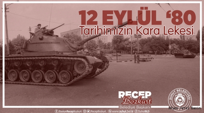 Şuhut Belediye Başkanı recep bozkurt 12 Eylül 1980 askeri darbesinin 40.yıl dönümünde bir mesaj yayımladı.Başkan Bozkurt mesajında”Allah bir daha bu millete; 27 Mayısları, 12 Eylülleri, 28 Şubatları, 15 Temmuzları yaşattırmasın.