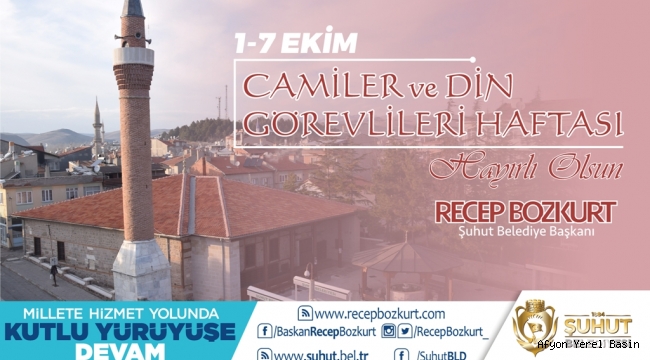 Şuhut Belediye Başkanı Recep Bozkurt 1 – 7 Ekim Camiler ve din görevlileri Haftası Dolayısıyla Bir Mesaj Yayımladı.Mesajında başkan Bozkurt”Her yıl 1 – 7 Ekim tarihlerinde kutlanmakta olan Camiler ve Din Görevlileri haftasının ülkemiz ve milletimiz için hayırlara vesile olmasını temenni ediyor, cami yapan, yaptıran yapımında emeği geçen, din hizmetinde emeği geçen ve ahrete intikal eden bütün din görevlilerini rahmetle anıyor, yaşayanlara sağlık, sıhhat ve başarılar diliyorum. Bu vesile ile din görevlilerimizin, “Camiler ve Din Görevlileri Haftasını en içten dileklerimle kutluyor, yaptıkları özverili çalışmalardan ötürü tebrik ediyorum”dedi.