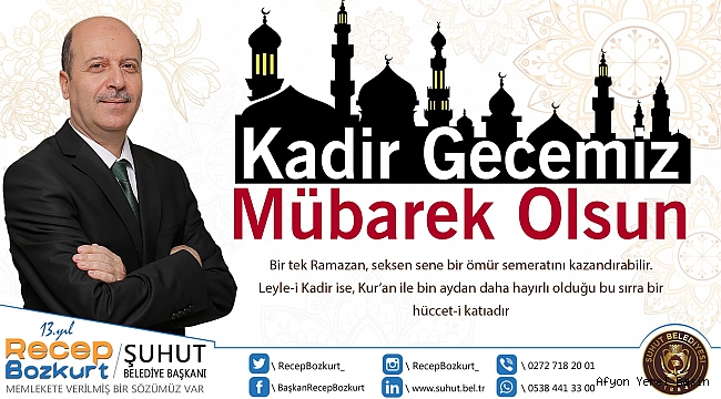 On bir ayın Sultanı Mübarek Ramazan-ı Şerif’i uğurlamaya hazırlanırken, Kadir Gecesi’ne erişmenin heyecan ve coşkusunu tüm Müslümanlar olarak hep birlikte yaşıyoruz.Yüce Kitabımız Kur’an-ı Kerim’de, “Kadir gecesi, bin aydan hayırlıdır.” mealindeki ayetle, bu gecenin esenlik dolu olduğuna işaret edilmektedir. Hiç şüphesiz bu mübarek gece, kalplerimizin kötülüklerden arınması, gönül dünyamızın aydınlanması, manevi huzurumuzun artması için bizlere eşsiz bir imkân ve fırsat sunmaktadır.Bu mübarek gecede, ruhumuzu karartan kötü duygu ve düşünceleri kalplerimizden atarak, nefretin kötü arzularını frenleyip, dünyamızı bulandıran haset, kin, düşmanlık gibi kötü duygulardan temizlenmek gerekir.Bu kutsal gecenin getirdiği esenlik ve selametin, tüm yurdumuzu, milletimizi ve bütün insanlığı çepeçevre kuşatmasını; yeryüzünde barış ve huzurun artırmasını temenni ediyorum.Bin aydan daha hayırlı olan Kadir Gecesi’nin İslam âlemi ve tüm insanlık için hayırlara vesile olmasını Yüce Rabbimden diliyor; tüm Şuhutlu hemşerilerimin Kadir Gecesini tebrik ediyorum.