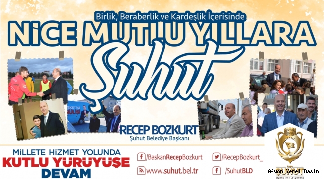 Şuhut Belediye Başkanı Recep Bozkurt yeni yıl dolayısıyla bir kutlama mesajı yayımladı.Başkan bozkurt mesajında”2020 yılının Şuhut’a ülkemize ve bütün insanlığa sağlık, mutluluk ve huzur getirmesini diliyorum.Şuhut Belediyesi olarak 2019 yılında yoğun bir şekilde hemşehrilerimize hizmet etmenin onurunu yaşadık.