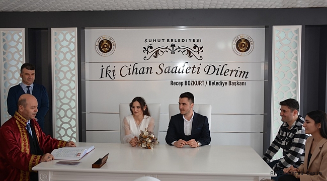 Şuhut Belediye Başkanı Recep Bozkurt, Şahitlerin ve davetlilerin katılımı ile Şuhut Belediyesi Nikah Salonunda gerçekleşen törende Ayşenur Yavuz ve Kamil Akalın çiftinin nikahını kıyarak yeni evlenecek olan çifte ömür boyu mutluluklar diledi.Yeni hayatlarında genç çifte mutluluklar dilediğini belirten Başkan Bozkurt; “Evlilik çok kutsal bir müessesedir. Tabii ki evlilik hayatınızda iyi ve kötü günleri birlikte yaşayacaksınız. Yeni hayatınızda karşınıza çıkacak olan engelleri, sorunları birlikte aşacaksınız. Her şeyden önce bu evliliğin sağlık mutluluk ve huzur içinde devam etmesini temenni ediyorum. Birbirinize Saygı, sevgi ve hoşgörünüzü birbirinizden eksik etmeyiniz. Sizlere sağlıklı ve sevgi dolu geçireceğiniz güzel günler, mutluluklar ve iki cihan saadeti diliyorum” dedi.