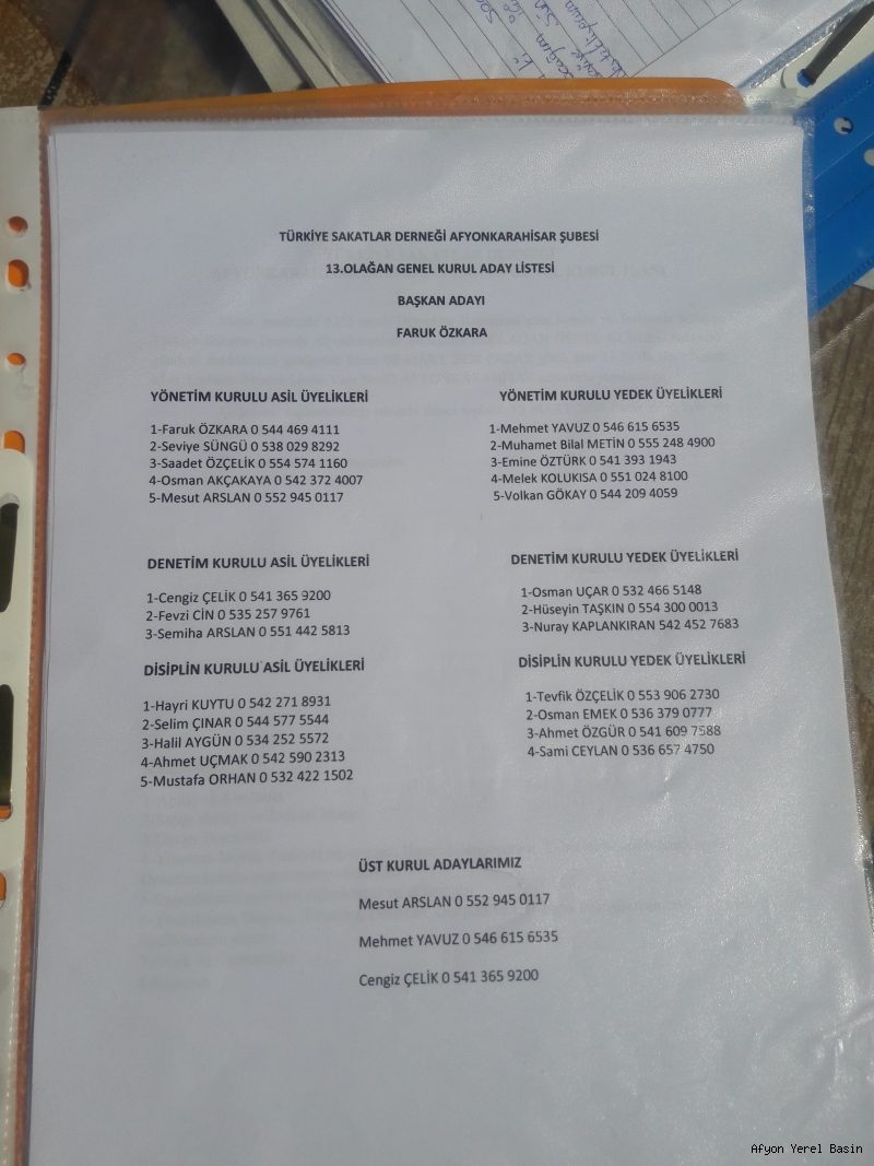 Yapılan kongre sonunda Türkiye Sakatlar Derneği Afyonkarahisar Şube başkanı seçilen Faruk ÖZKARA’nın başkanlığındaki dernek yönetim kurulu asil üyeliklerine, “ Faruk Özkara, Seviye Süngü , Saadet Özçelik , Osman Akçakaya ve Mesut Arslan, seçildi. Denetim kurulu üyeliklerine de, Fevzi Cin ve Semiha Arslan seçildi.