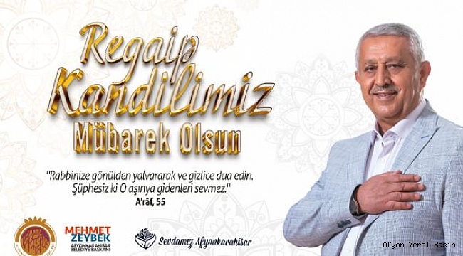 Belediye Başkanı Mehmet Zeybek, Regaip Kandili dolayısıyla kutlama mesajı yayınladı. Mübarek Üç Ayların başlangıcı olan Regaip Kandilinin Ramazan-ı Şerif'in müjdecisi olduğunu belirten Başkanımız Zeybek, bu aylarda sevgi, saygı ve yardımlaşma duygularının doruğa ulaştığını vurguladı.