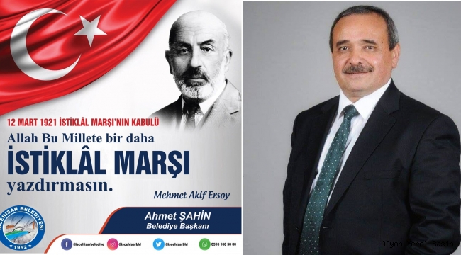 İscehisar Belediye Başkanı Ahmet Şahin, İstiklal Marşımızın kabulünün 100. Yılı dolayısıyla yayımladığı mesajında; Mehmet Akif Ersoy’u ve istiklal mücadelemizin tüm kahramanlarını rahmetle andı.