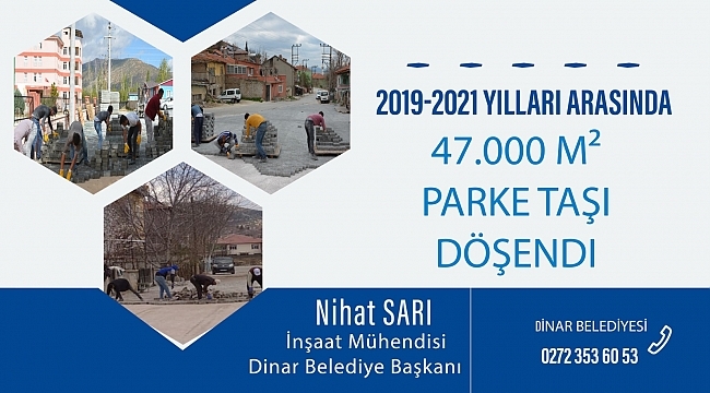 Altyapı ve Üstyapı çalışmaları ile ulaşım yönünden de modern bir ilçe konumuna gelmek amacıyla Dinar Belediye Başkanımız Nihat Sarı’nın talimatları ile 2019-2021 yılları arasında belediyemiz tarafından ihtiyaç duyulan mahalle ve sokaklarımıza toplam 47 bin m² parke taşı döşendi.