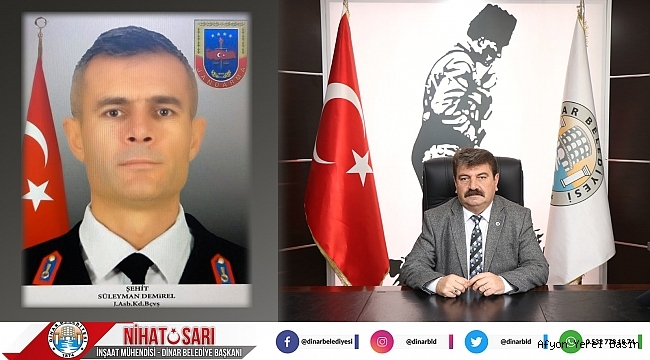 Dinar Belediye Başkanımız Nihat Sarı Suriye’de el yapımı patlayıcının etkisiz hale getirildiği sırada şehit düşen Dazkırı İlçesi Aşağı yenice Köyü nüfusuna kayıtlı J. Asb. Kd. Bçvş. Süleyman Demirel için bir başsağlığı mesajı yayımladı.