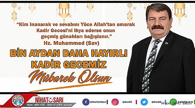 Dinar Belediye Başkanımız Nihat Sarı, Kadir Gecesi dolayısıyla bir mesaj yayımladı.Belediye Başkanımız nihat sarı mesajında; “Kadir Gecesi Ramazan-ı şerif ayı içinde bulunan ve Kuran-ı Kerim’de methedilen en kıymetli gecedir. Kadir Gecesi, bin aydan hayırlı ve Yüce kitabımız Kuran’ın indirilmeye başlandığı, esenlik ve güvenliğin her tarafa yayıldığı ve tövbelerin kabul edildiği kutlu bir gecedir. Bu mübarek gecede, Allah’tan bizleri samimiyetle ve istikametten ayırmamasını, doğruyu bulduktan sonra kalplerimizi eğriltmemesini ve bizleri affetmesini dileyelim. Bu duygu ve düşüncelerle Kadir Gecesinin Dinarlı hemşerilerime ve bütün insanlığa sevgi, barış ve huzur getirmesini Yüce Allah’tan niyaz ederim.” ifadelerini kullandı.
