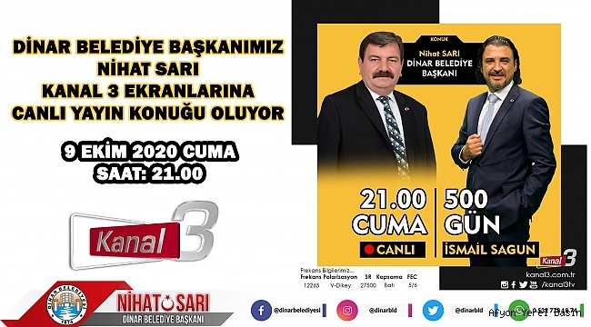 Dinar Belediye Başkanımız Nihat Sarı, Kanal 3 ekranlarında yayınlanan İsmail Sagun’un moderatörlüğünü yaptığı 500 gün adlı programa konuk oluyor.