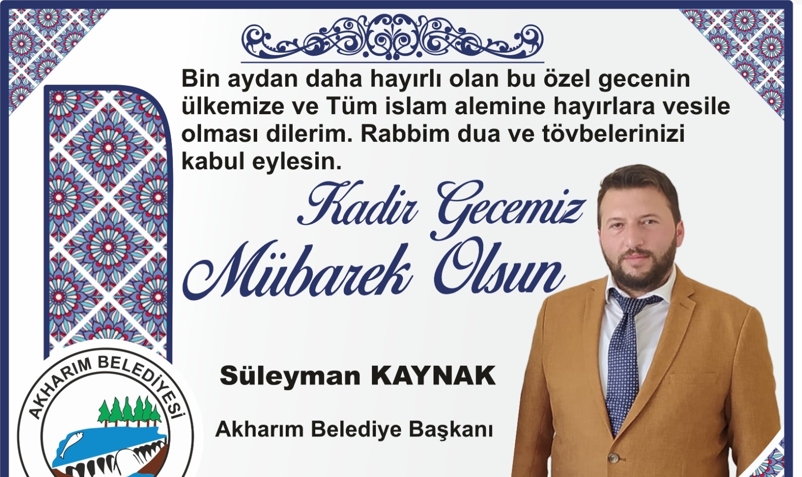 Afyonkarahisar Sandıklı İlçesine bağlı Akharım Belediye Başkanı Süleyman Kaynak, Kadir Gecesi dolayısı ile mesaj yayımladı.