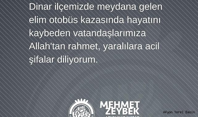 Belediye Başkanı Mehmet Zeybek, Dinar ilçesine bağlı Karabedir köyü yakınlarında meydana gelen otobüs kazasında hayatını kaybeden yolcular için taziye mesajı yayımladı. “Dinar ilçemizde meydana gelen elim otobüs kazasında hayatını kaybeden vatandaşlarımıza Allah'tan rahmet, yaralılara acil şifalar diliyorum.” dedi.