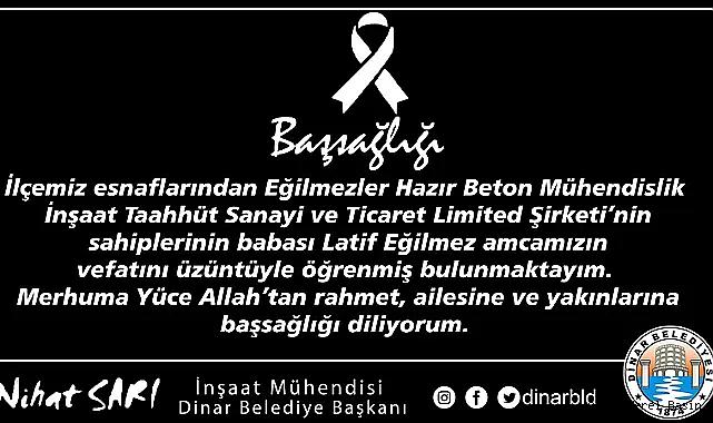 Dinar Belediye Başkanı Nihat Sarı, İlçemiz esnaflarından Eğilmezler Hazır Beton Mühendislik İnşaat Taahhüt Sanayi ve Ticaret Limited Şirketi’nin sahiplerinin babası Latif Eğilmez'in vefatı dolayısıyla bir başsağlığı mesajı yayımladı.