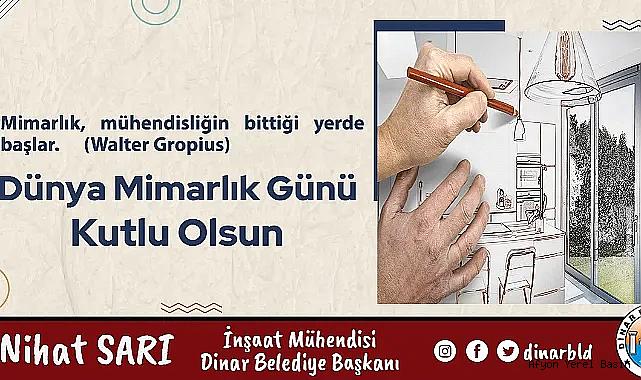 Şahsım da 3 çocuğumun mimarlık mesleğini icra etmesinden dolayı mutlu ve gururluyum. Bu duygu ve düşüncelerle Kıymetli usta Mimar Sinan’ın ve mimarlık bilincinin öneminin bir kez daha algılandığı bugünde İlçemizde görev yapan mimarlarımız başta olmak üzere tüm mimarlarımıza çalışmalarında sağlık ve mutluluk dolu bir yaşam içinde başarılar diliyor, Dünya Mimarlık Günü’nü kutluyorum.” dedi. Dinar Gündem Gazetesi