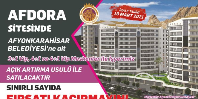 Çetinkaya Mahallesi’nde mülkiyeti Belediyemize AFDORA Sitesi bulunan 3+1, 4+1 ve 4+ 1 vip meskenler ile işyeri satışa çıkıyor. 10 Mart Çarşamba günü saat 14:00’de Belediye Meclis Salonunda yapılacak ihale, açık arttırma usulü gerçekleşecek. Afyon Kalesi-Sarıkız manzaralı Atatürk Caddesi ve Ciritler Kayalığına (Millet Bahçesine) cepheli daireler site bazında olup; güvenlik, oyun ve spor salonu, açık-kapalı oyun alanları, market, ütü, oto yıkama, kapalı otopark, kapalı seyir terasları vb. sosyal yaşam olanaklarına sahip. İhaleye katılmak isteyenler 10 Mart Çarşamba günü saat 12.00’ ye kadar Belediyemiz Emlak ve İstimlâk Müdürlüğüne başvuruda bulunmaları gerekmektedir.AFDORA SİTESİ SOSYAL İMKANLAR- Oto Yıkama : Site sakinlerinin araçları , personel tarafından oto yıkama bölümünde iç dış yıkanır ,- Ütü odası: Site sakinlerinin kıyafetleri evden teslim alınıp ütülenir, evlerine tekrar bırakılır- Bilardo salonu: Site sakinleri Amerikan veya üç top bilardo oynayabilir- Game Center : Çocuklarınız langırt, buz hokeyi, basketbol makineleriyle boş zaman değerlendirebilir- Çocuk oyun odası : Çocuklarınız siteye ait kreşte türlü oyuncaklarla eğlenceli vakit geçirebilir- Masa Tenisi Odası : Site sakinleri Profesyonel tenis masalarında , masa tenisi oynayabilir- Spor Salonu : Her türlü profesyonel Spor aletlerinin olduğu salonumuz sabah 8 akşam 23:30 hizmetinizdedir- Seyir terası: Sitemizin 11. Katında bulunan seyir terasında, şehir manzarası ile kahvenizi içebilirsinizKafeterya: Küçük bir market misali çalışan kafeteryamız, evlere hizmet vermektedir ve temel ihtiyaç malzemeleri hep olmaktadır. Her haftasonu sıcak gözleme ve katmer yapılmaktadır.- Bahçe : Yeşillikle dolu bahçede , güzel havalar için yeterli oturma bankı ve kamelyalar bulunmaktadır- Açık hava Çocuk Parkı: Kapalı çocuk oyun odası haricinde , güzel havalarda çocuklarınız için çocuk oyun parkı bulunmaktadır.- Seyir Havuzları : Her balkonun gördüğü üç adet seyir havuzları gözlere hitap eder .- Etüt odası: Akıllı tahta ve internet hizmetinin bulunduğu etüt odasında , çocuklarınız kendileri veya öğretmenleri ile ders çalışabilir.- Güvenlik: Sitemiz CCTV ile 24 saat izlenir, güvenlik görevlileri tarafından korunurKapalı Otopark: Ferah kapalı Otoparkta her daire için bir araçlık yer bulunur .