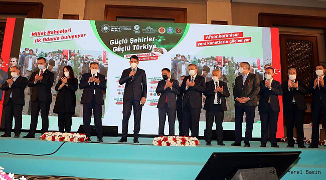 Bakan Kurum, Afyonkarahisar'ın Türkiye'nin büyümesinden büyük pay sahibi olmuş şehirlerden biri olduğunu vurguladı.“BU AZİZ ŞEHİR ANADOLU’NUN VE KUDÜS’ÜN KİLİDİDİR”Afyonkarahisar’ımızın tarihi; şan ve şereflerin tarihi olduğuna dikkat çeken Bakan Kurum, “Kudüs’ü işgale giden Haçlı Ordularını engelleyen de; Anadolu’yu işgale yeltenen Yunan ordularına “geçemezsin! dur!” diyen de Afyonkarahisar’dır, Afyonkarahisar’ın kahraman evlatlarıdır. Bu aziz şehir; Anadolu’nun ve Kudüs’ün kilididir” dedi.“ÇOK ÖNEMLİ KARARLAR ALDIK”“Bu şehre hizmet etmek; boynumuzun borcudur” diyen Çevre ve Şehircilik Bakanı Murat Kurum, “Bu istiklal şehrini en güzel şekilde istikbale taşımak hepimizin vazifesi, sorumluluğu.Bugün bu inançla, bu duygularla buradayız. Bu duygularla, sizlerin misafiriyiz. Biraz önce; saygıdeğer Bakanımız Veysel Eroğlu ağabeyimizle, Valimiz, milletvekillerimiz, Belediye Başkanımızla; son derece kapsamlı bir değerlendirme toplantısı yaptık, çok önemli kararlar aldık” dedi.264 MİLLET BAHÇEMİZİN YAPIMINA DEVAM EDİYORUZ Bakanlık bünyesinde yapılan çalışmalara ilişkin de bilgiler aktaran Çevre ve Şehircilik Bakanı Murat Kurum; "Şehrimize, bugüne kadar ulaştırmadan sağlığa, eğitimden, turizm, tarım, çevre ve şehirciliğe kadar yaklaşık 35 milyarlık yatırım yapıldı. Bakanlık olarak; biz de bu yatırımların 7 milyar lirasını gerçekleştirmiş olmanın mutluluğunu yaşıyoruz. İşte bugün de inşallah hep birlikte, bir yandan kentsel dönüşüm ve sosyal konutlarımızın müjdelerini verirken, bir yandan da Türkiye'nin yeşil alan miktarını en çok arttıran illerimizden biri olan Afyonkarahisar'ın 3 millet bahçesini inşallah fidanlarla buluşturacağız. Biliyorsunuz bugün ülkemizin tamamında, toplam büyüklüğü 55 milyon metrekareyi bulan 321 adet millet bahçesi yapıyoruz. 57 millet bahçemizi bitirdik ve vatandaşların hizmetine sunduk. 264 millet bahçemizin yapımına devam ediyoruz." Bakan Kurum konuşmasına şöyle devam etti "İnşallah 2023'e kadar her ilimizde en az bir millet bahçesini vatandaşlara, çocuklara, gençlere armağan edeceğiz. Tarihimizi ve kadim kültürümüzü, birlikte yaşama geleneğimizi, bu büyük parklarımızda, bu güzel millet bahçelerimizde yaşatacağız"