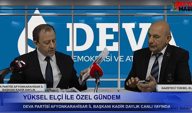 Deva Partisi Afyonkarahisar İl Başkanı Kadir Daylık Gazeteci Yüksel Elçi’nin hazırlayıp sunduğu Özel Gündem Programında Afyonhaber Tv ve Armoni FM (98.1) ortak canlı yayınına konuk oldu.