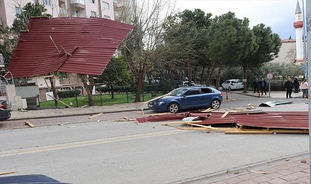 Denizli'nin Pamukkale ilçesinde etkili lodos nedeniyle bir apartmanın uçan çatısı 6 araca zarar verdi, çatının düşme anı güvenlik kamerası tarafından kaydedildi. Kuşpınar Mahallesi Emek Caddesi'ndeki 8 katlı apartmanın çatısı lodos nedeniyle uçtu. Parçalar halinde savrulan metal çatı, park halindeki 6 aracın üstüne düşerek hasara yol açtı.Çatının bir parçası apartmanın bahçesindeki ağaçta takıldı. Başka bir parça da apartmanın en üst katından sarkarak tehlike oluşturdu.İhbar üzerine olay yerine polis, itfaiye ve sağlık ekipleri sevk edildi. Fenalaşan bir vatandaş, ambulansla hastaneye kaldırıldı.Polis ekipleri olay yeri ve çevresinde güvenlik önlemi aldı, cadde bir süre trafiğe kapatıldı. Apartmanın çevresinde önlem alan ekipler, çatı parçalarını topladı.Parçaların toplanması ve hasar gören araçların kaldırılmasının ardından yol tekrar trafiğe açıldı.Apartman çatısının düşme anı bir iş yerinin güvenlik kamerasınca kaydedildi. Görüntülerde, metal çatı parçasının yola düşmesi, seyir halindeki otomobil sürücüsünün, uçan çatının altında kalmaktan son anda kurtulması da yer aldı.Öte yandan kentte etkili olan lodos nedeniyle farklı noktalarda ağaçların devrilmesiyle bazı araçlarda hasar oluştu.- İzmir'de sağanak yüzünden bazı ev ve iş yerlerini su bastıİzmir'de, sağanak nedeniyle Dikili ve Aliağa ilçelerindeki bazı iş yerleri ve evleri su bastı. Belediye ekipleri, ev ve iş yerlerindeki suları tahliye etmek için çalışma başlattı.İlçe merkezinde de sağanak sebebiyle yolların su dolmasıyla araçlar ilerlemekte güçlük çekti.- Ege'de fırtına uyarısıİzmir'e bugün için yağış ve lodos uyarısı yapan Meteoroloji 2. Bölge Müdürlüğü yarın için de fırtına olabileceğini bildirdi.Yapılan açıklamada Kuzey Ege'de rüzgarın yarın öğle saatlerinden itibaren, Güney Ege'de ise gece saatlerinden itibaren fırtına şeklinde eseceği belirtildi.
