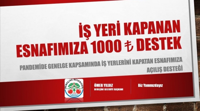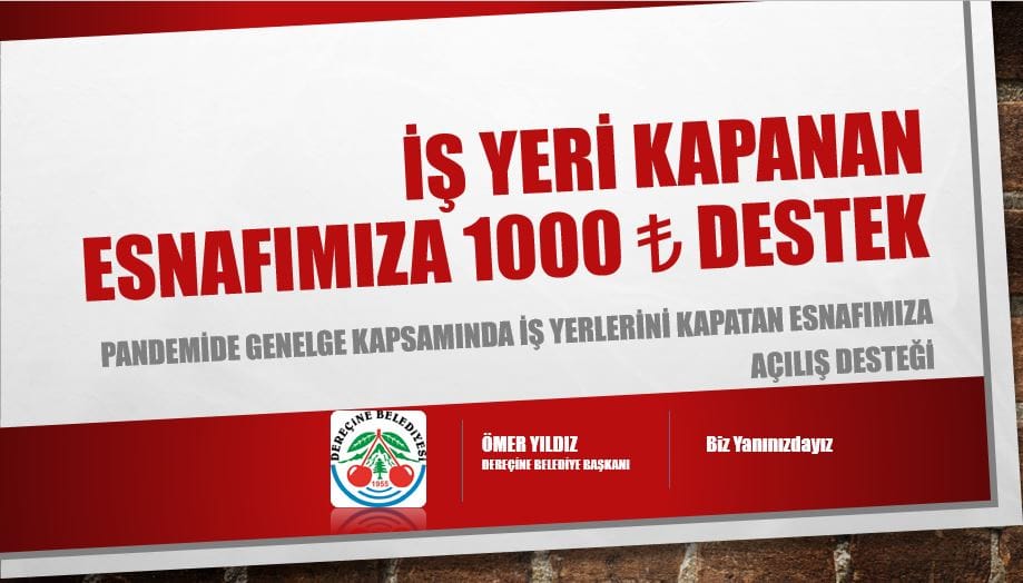 Duyuruda; "Dereçine Belediye Meclisimizin bugün aldığı karar gereği yarın işyerlerini açacak olan, pandemi sebebiyle işyerlerini kapatmak zorunda kalan esnafımıza "Hayırlı işler" desteği veriyoruz. Biz yanınızdayız." denildi.