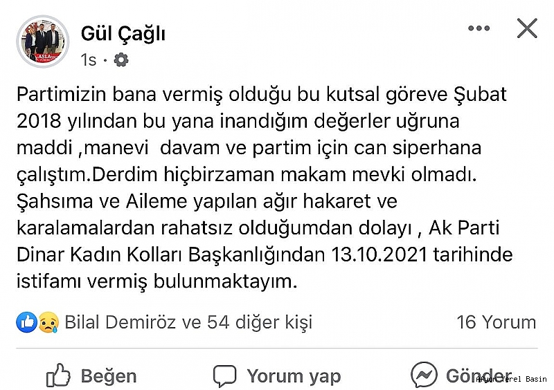 Dinar'da Gül Çağlı Ak Parti Kadın Kolları Başkanlığı görevinden istifa etti.Ak Parti Dinar Kadın Kolları Başkanı gül Çağlı sosyal medya hesabından istifa ettiğini duyurdu.