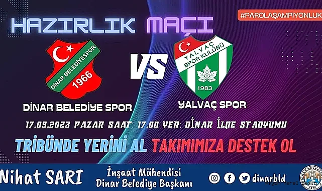 Dinar Belediye Başkanımız Nihat Sarı, “Şampiyonluk Parolası” ile sezona başlayacak olan takımımızın yeni sezon öncesinde çıkacağı hazırlık maçına tüm halkımızı davet ederek, takımımıza başarılar diledi. Dinar Gündem Gazetesi
