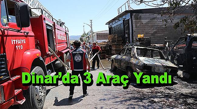 Dinar Sanayi Sitesinde Demircilik yapan Ali Gürbüz'e ait dükkanın kenarında çıkan yangında atıl durumda bulunan 3 tane araç alev aldı.