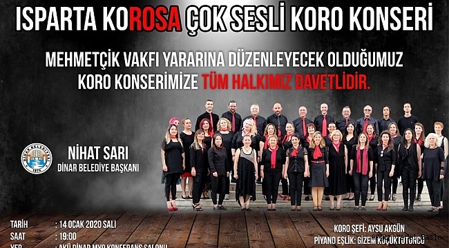 Dinar Belediyesi sponsorluğunda Mehmetçik Vakfı yararına yapılacak olan konserde sahne alacak olan Koronun; Isparta'da 2012 yılından kurulan Isparta Polifonik Korolar Derneği Yetişkiler Korosu (KoROsa), kentin kültürüne, sosyal yaşamına farklı bir renk, bambaşka bir soluk vermek amacıyla çalışmalarına başladı. Sosyal sorumluluk ve çok sesli müziğin tanıtımı adına koro Türkiye'nin birçok ilinin yanı sıra Isparta, Gelendost, Eğirdir ilçelerinde, şehrin hastanelerinde ve okullarında konserler verdi. Doktorun, öğretmeninden, muhasebecisine kadar farklı meslek gruplarından oluşan yetenekli insanlar Türk ve Dünya müziklerini evrensel çok sesli müziğin kurallarına göre seslendirmeye çalışıyorlar. KoRosa 2014 ve 2016 Pamukkale Üniversitesi tarafından düzenlenen Korolar Festivaline, 2015 ve 2018 yılında Ankara Türkiye Korolar Şenliğine, 2015 ve 2019 yıllarında Çanakkale Korolar Festivaline ve 2016 yılında 1. İzmir Uluslararası Korolar Şenliğine katılarak Isparta'yı başarıyla temsil etti. 2017 Makedonya Ohrid Müzik Festivaline katılan KoRosa ekibi, kentin tek çok sesli koro olarak aktif bir şekilde çalışmakta. Koro kuruluşundan bu yana Müzik Öğretmeni Aysu Akgün nezaretinde birçok sosyal projelere imza atmanın gururunu yaşıyor.