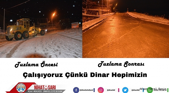 Dinar Belediye Başkanımız Nihat Sarı'nın talimatları doğrultusunda belediyemiz ekipleri araç ve iş makinaları ile buzlanma riski olan yollarda tuzlama çalışmaları yapıldı.