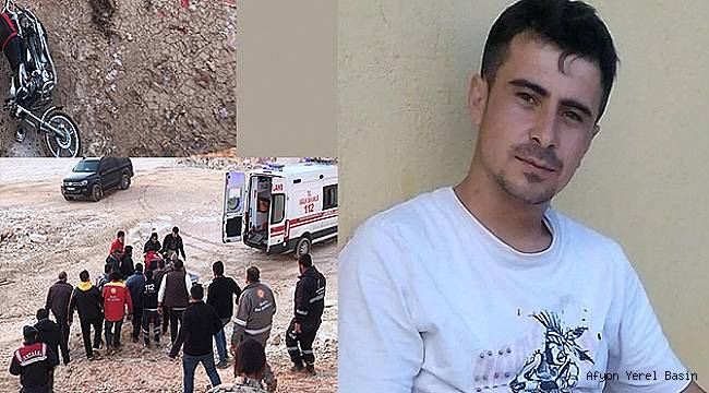 Dinar İlçesine bağlı Bülüçalan köyünde ikamet eden Orhan E. (33) edinilen bilgilere göre motosikleti ile dağ yolundan inerken yağmur yağışı yolu kayganlaştırması sebebiyle motosikleti kaydırmak sureti ile direksiyon hâkimiyetini kaybeden Orhan E. tahminen 15 metrelik mermer ocağının çalışma yaptığı boşluk alana düştü.