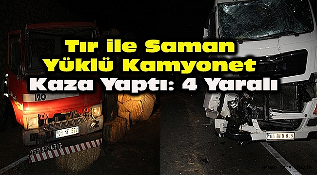 Kaza dinar İlçesinde mezarlık mevkiinde dün saat: 19:30 civarlarında meydana geldi.Afyonkarahisar Sandıklı karayolu Dinar İlçesi mezarlık mevkiinde edinilen bilgilere göre Ömer Kuyrukçu (48) idaresinde ki 06 BEB 839 plakalı TIR Güngör Ateş (39) hakimiyetinde bulunan 03 NF 577 plakalı saman yüklü kamyonete çarptı. Kazada 4 kişi yaralandı.İhbar üzerine olay yerine 112 sağlık ekipleri ve trafik ekipleri sevk edildi.Olay yerine gelen 112 sağlık ekipleri tarafından yaralı olan Kamyonet sürücüsü Güngör Ateş’i ve TIR sürücüsü Ömer Kuyrukçu’yu beraberinde ki Ufuk Başyiğit(36) Nevzat Emir Kuyrukçu (9) ambulans ile Dinar Devlet Hastanesine götürüldü.Tedavilerine Dinar Devlet Hastanesinde devam ettiği bildirildi.Kaynak Dinar Gündem GazetesiTahsin Baytar