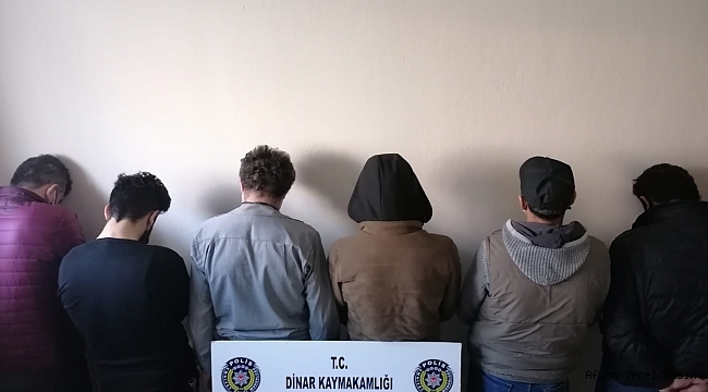 Dinar İlçesi genelinde uyuşturucu veya uyarıcı madde ticareti yapan, kullanan yada bulunduran şahısların tespiti ve yakalanmalarına yönelik olarak yapılan çalışmalarda, 2020 ve 2021 yılı içerisinde, İlçemizde ikamet eden A.A, H.E.O, T.M, H.E, M.H.E, Y.A. isimli 6 ayrı Yabancı Uyruklu şahıs hakkında uyuşturucu veya uyarıcı madde imal veya ticareti, kullanmak amacıyla uyuşturucu veya uyarıcı madde bulundurmak, kabul etmek, özel hayatın gizliliğini ihlal, şantaj, tehdit suçlarından 6 ayrı yasal işlem yapıldığı belirlenmiş, şahıslar sınır dışı işlemleri için ilçe emniyet müdürlüğümüzce 19.01.2021 günü sınır dışı edilmek üzere gözlem altına alınmıştır.