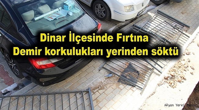 Dinar Fatih Mahallesi Toki Konutlarında Duvar üzerine yapılan demir korkuluklar otomobillerin üzerine düştü.Aşırı rüzgarın etkisine demir korkuluklar dayanamadı. Rüzgarın etkisiyle yerinden sökülen demir korkuluklar 5 Otomobilin üzerine devrildi. Otomobil sahipleri Toki konutlarını yapan müttehitlerin sağlam yapmadığını iddia etti. Araçları hasar gören vatandaşlar sigortacıları arayarak yardım istediler.Kaynak Dinar Gündem GazetesiTahsin Baytar