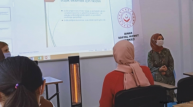 Dinar İlçesinde yakın zamanda faaliyete geçen Dinar Kadın Kültür Evimizde bugün İlçe Sağlık Müdürlüğü eğitmenimiz tarafından"Akılcı İlaç Nedir" konulu ve İlçe Sosyal Hizmetler Müdürlüğü eğitmenleri tarafından "Aile hukuku& Kişi hukuku" konulu eğitimler verildi.