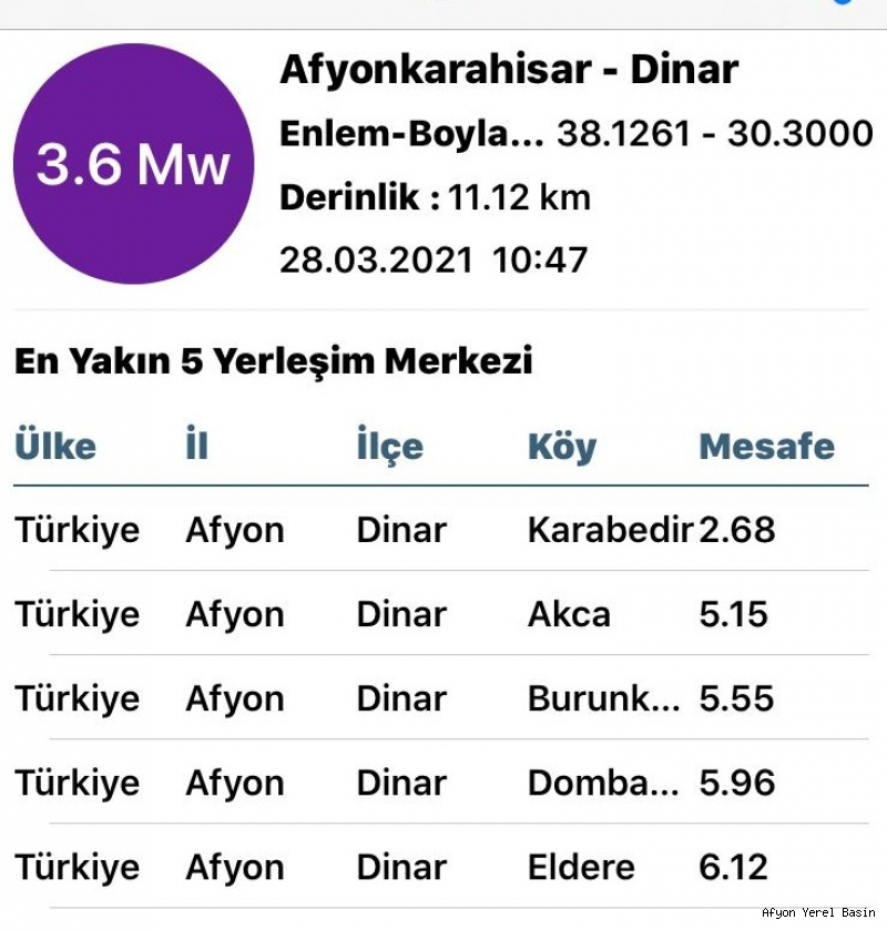 Boğaziçi Üniversitesi kandilli Rasathanesi verilerine göre Saat 10:47 'de Merkez üssü Dinar Karabedir Köyü 3. 6 şiddetinde bir deprem meydana geldi.