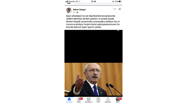 Dinar İlçemize bağlı Kınık Muhtarı Adem Sargın sosyal medya hesabından CHPGenel Başkanı Kemal Kılıçdaroğlu'nun resmini paylaşarak sert dille eleştirdi.Muhtar Adem Sargın: "Sayın arkadaşlar bu zat diyarbakırda konuşmasında selattin demirtas denilen şerefsiz ve osman kavala denilen köpeği cezaevinden çıkaracağını söylüyor hiç mi zorunuza gitmiyor hergün bazot yağ paylasiyorsunuz bu konuda diyecek hiçbir şeyiniz yokmu."dedi Dinar Gündem