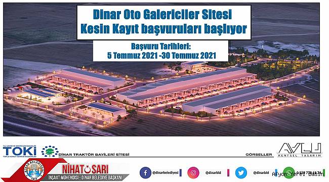 Dinar Belediye Başkanımız Nihat Sarı’nın girişimleriyle seçim beyannamesinde yer alan ve ilçemize yapılacak olan Oto Galericiler Sitesi için kesin kayıt başvuruları başlıyor.